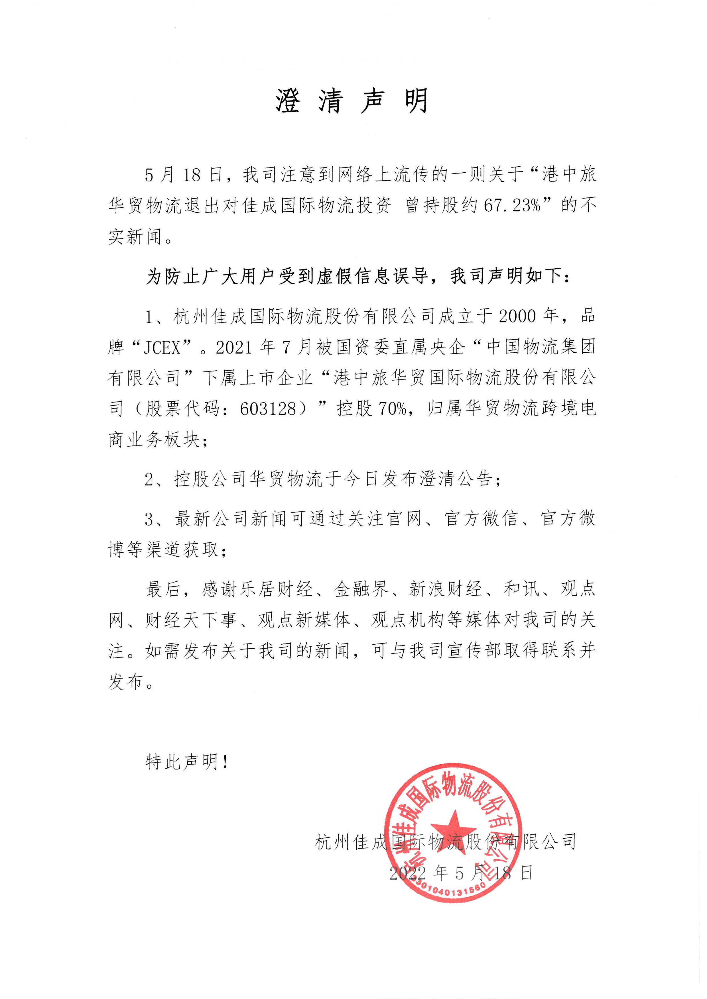 5月18日,我司注意到网络上流传的一则关于“港中旅华贸物流退出对佳成国际物流投资 曾持股约67.23%”的不实新闻。